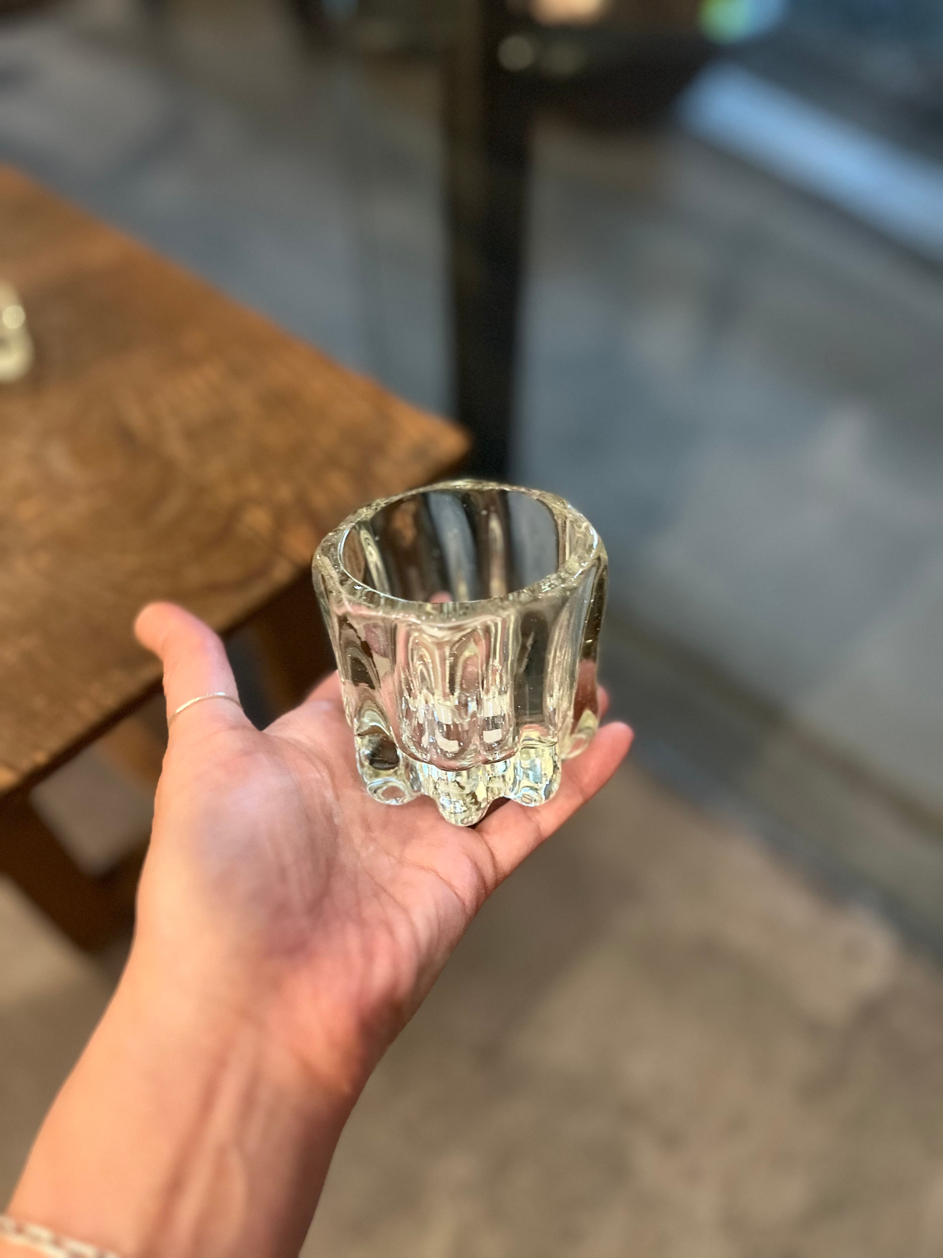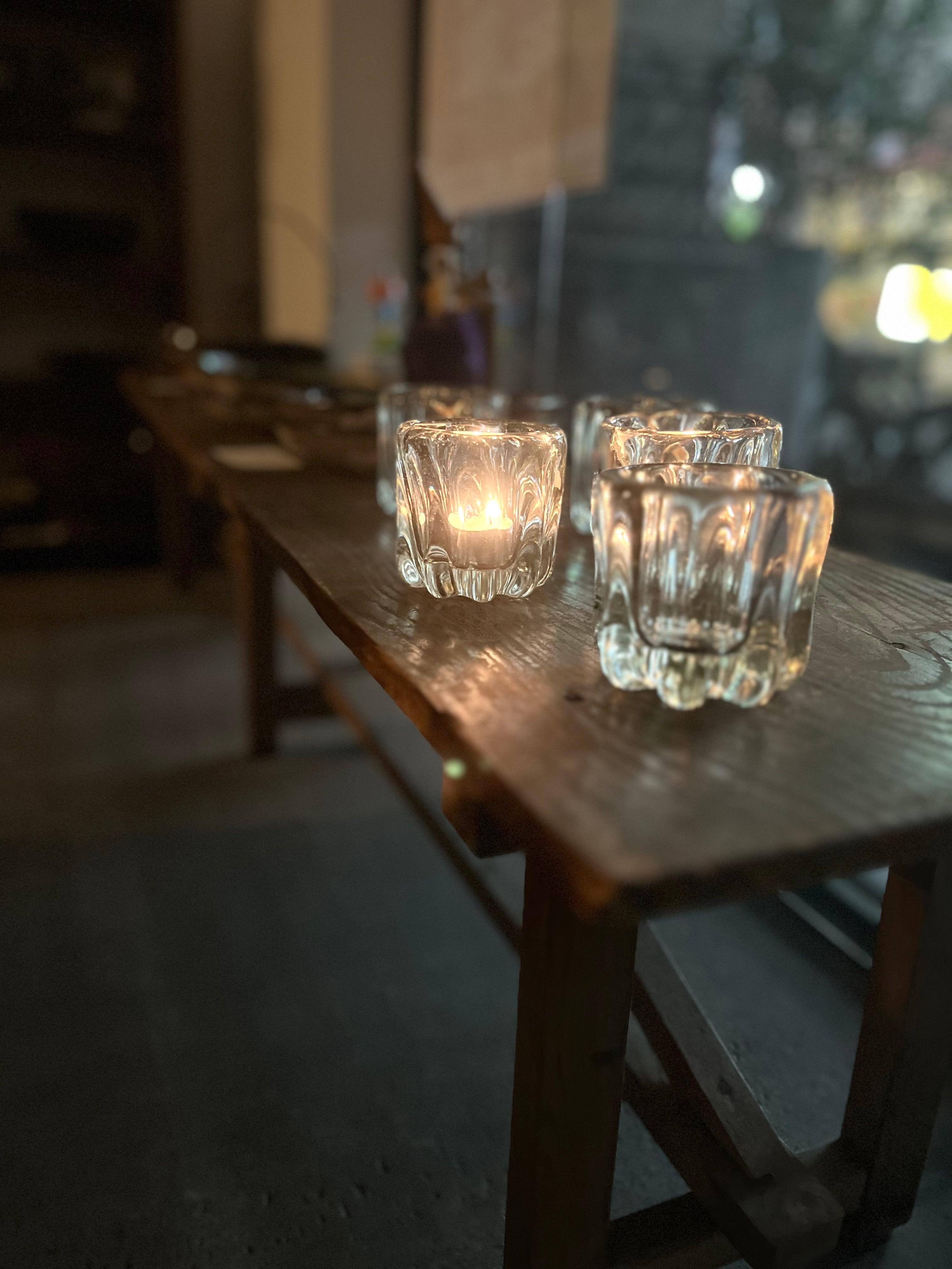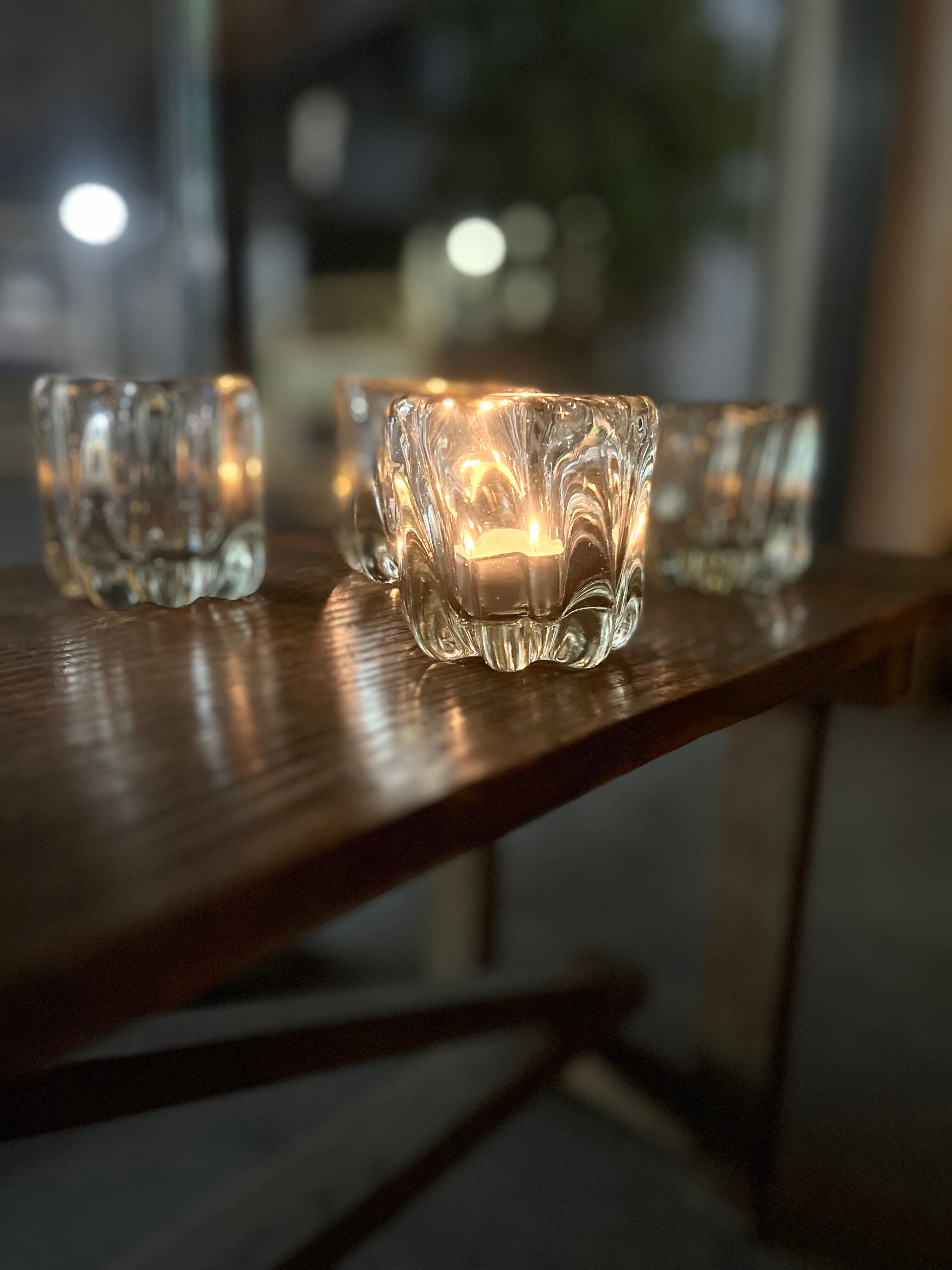 これからの秋の夜長〜冬に楽しめる、吹きガラスで作られた厚みのあるキャンドルホルダーです。肉厚のガラスにゆらめぐ明かりを楽しんでいただけます。写真で使っているキャンドルはIKEAのキャンドルです。キャンドルの他にもアロマキャンドルなども入れてお使いいただけます。