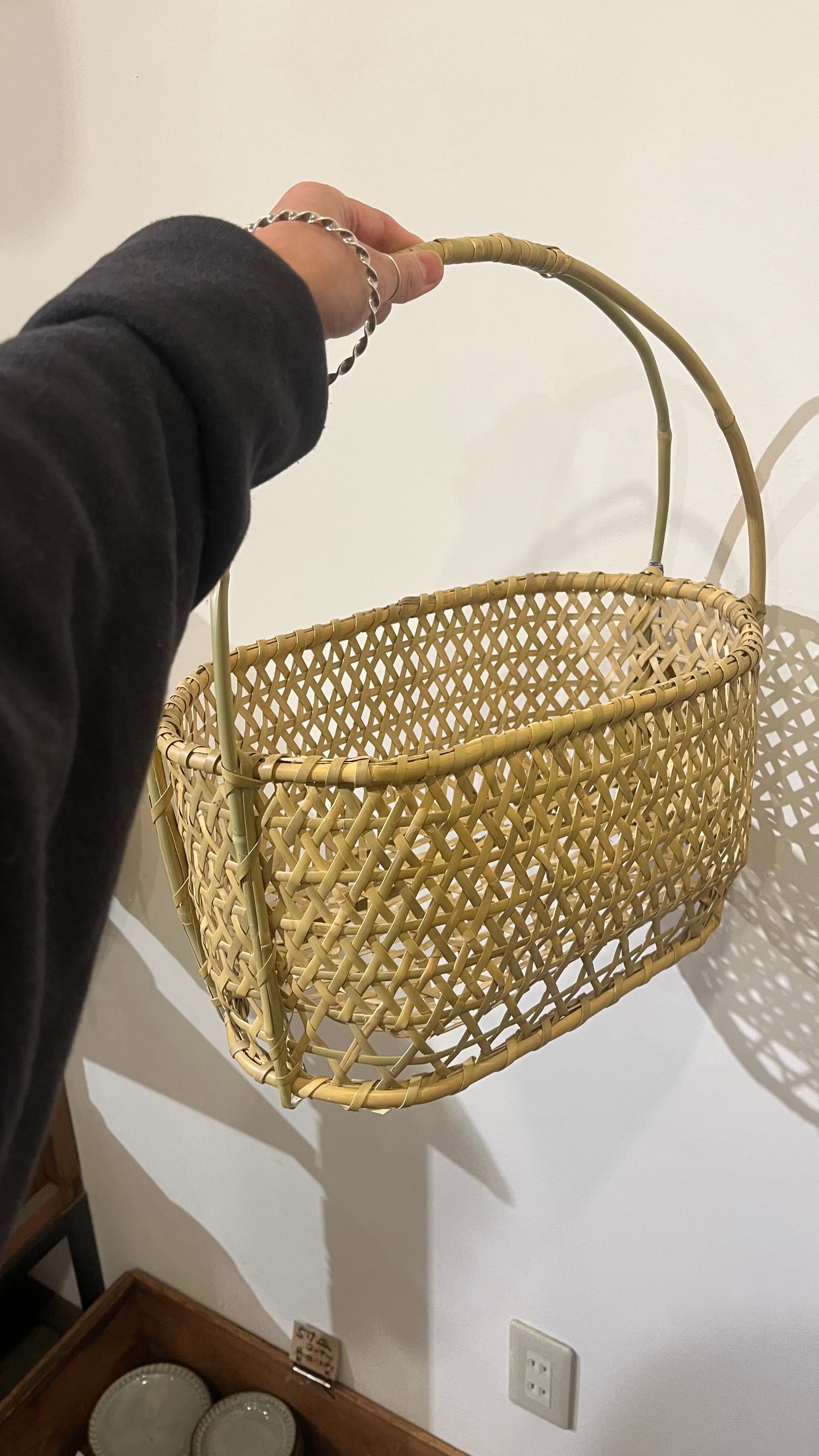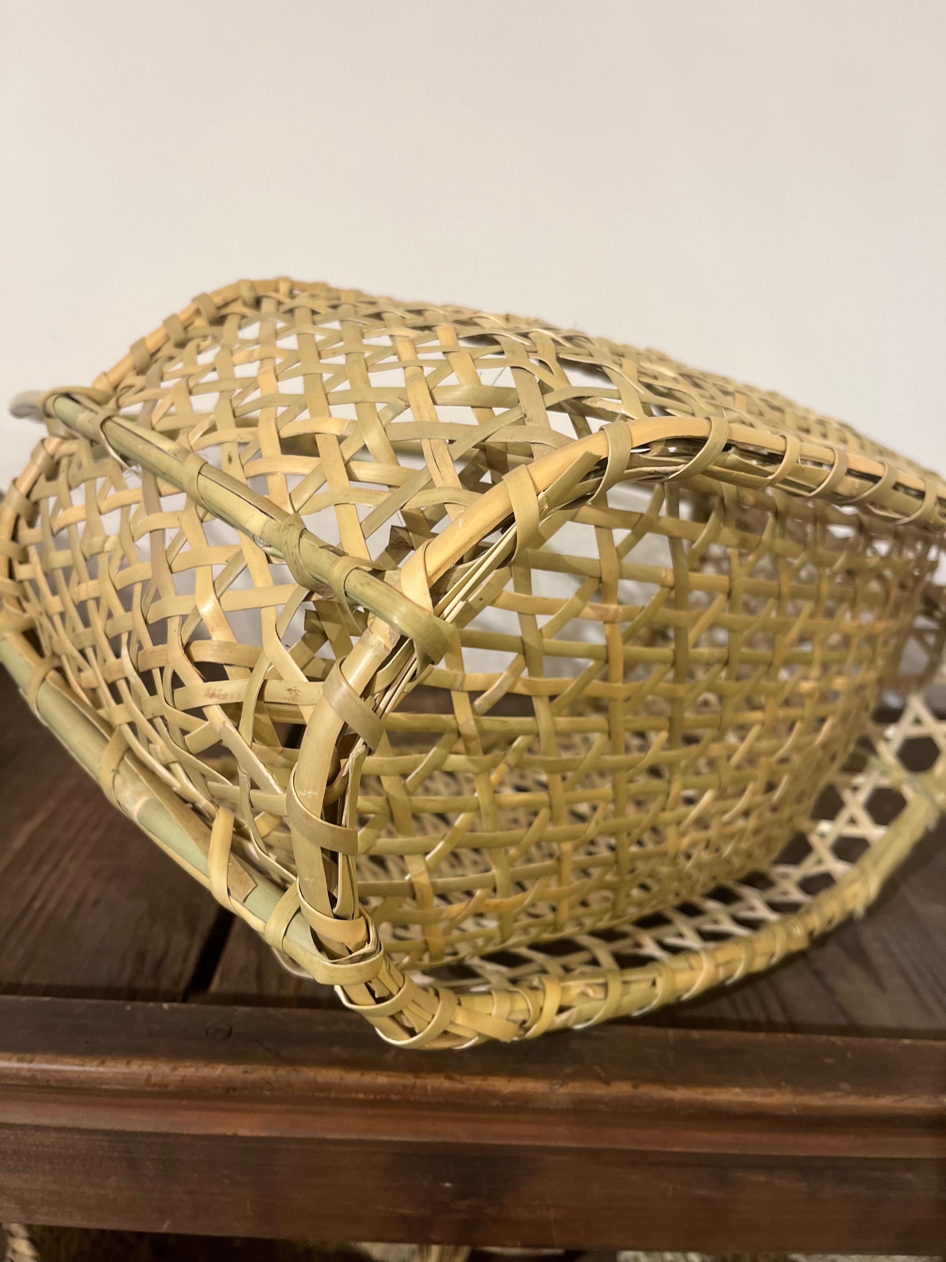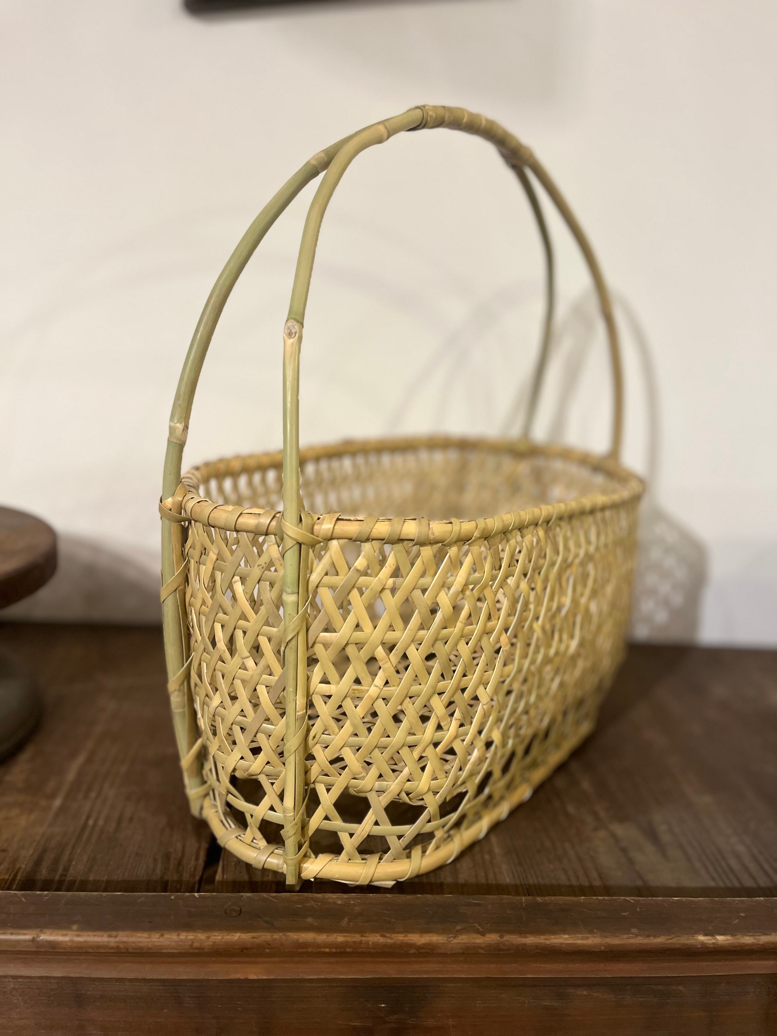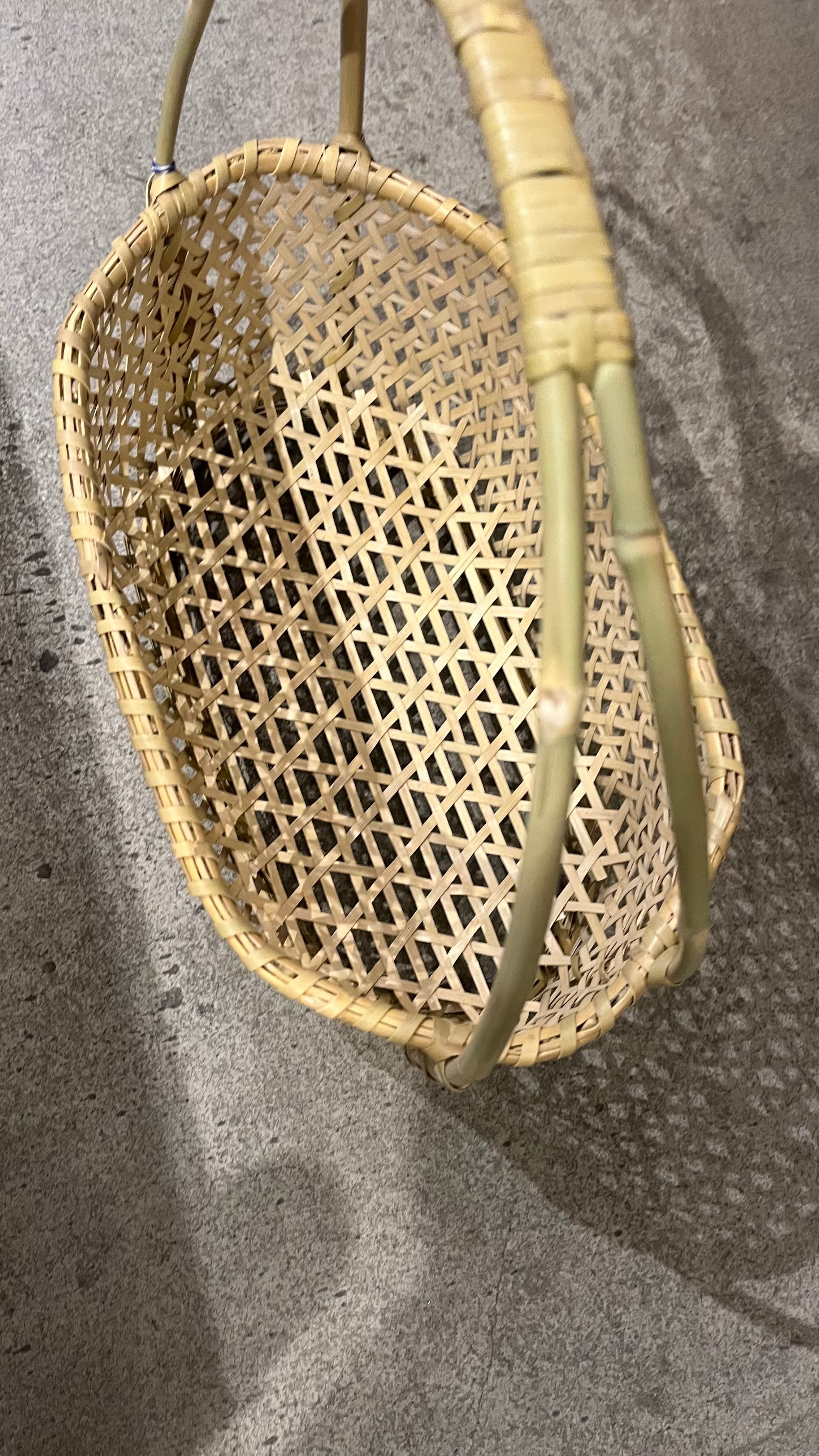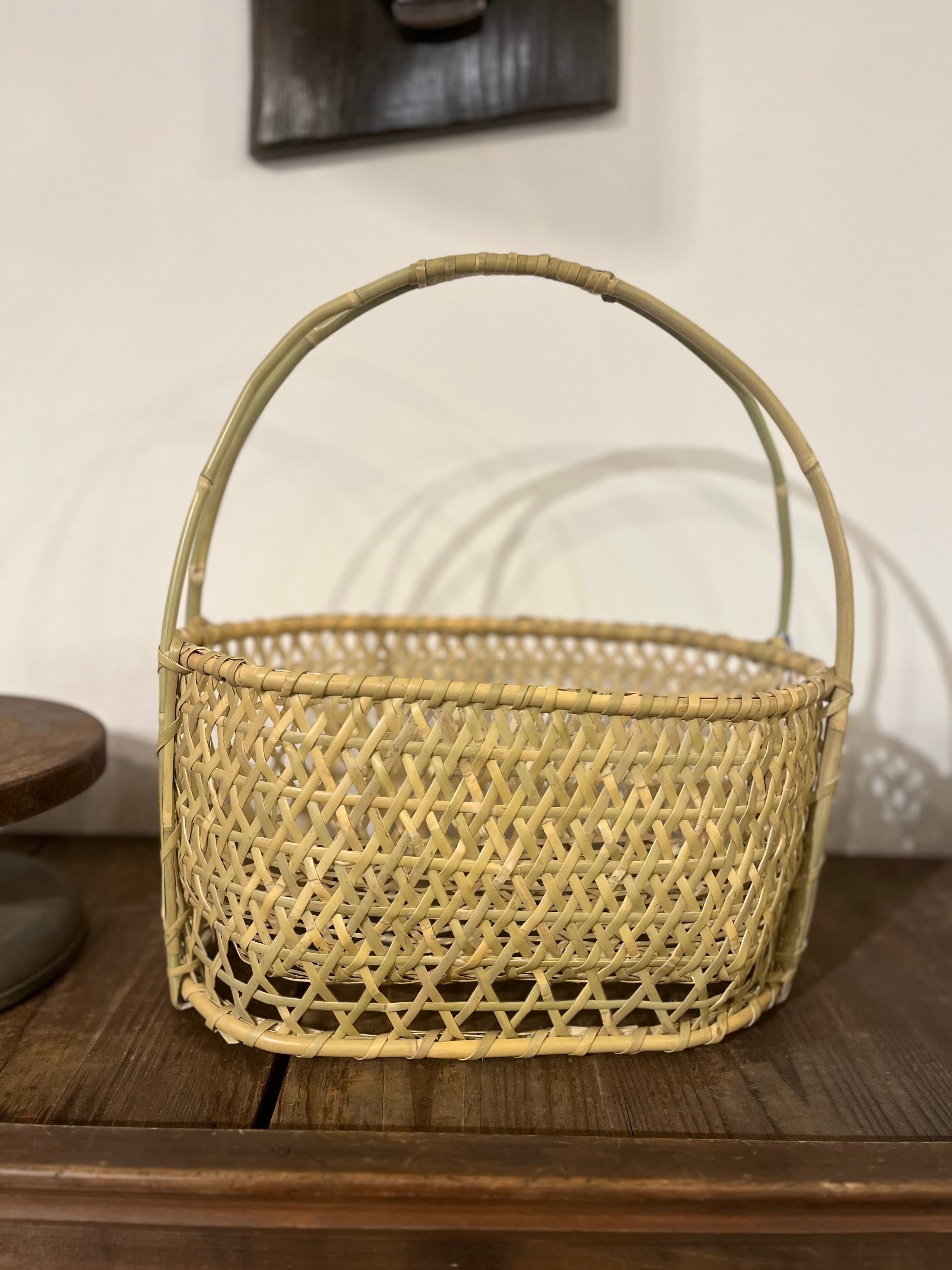 長野県で作られている根曲がり竹返し編み取って付き六角楕円かご