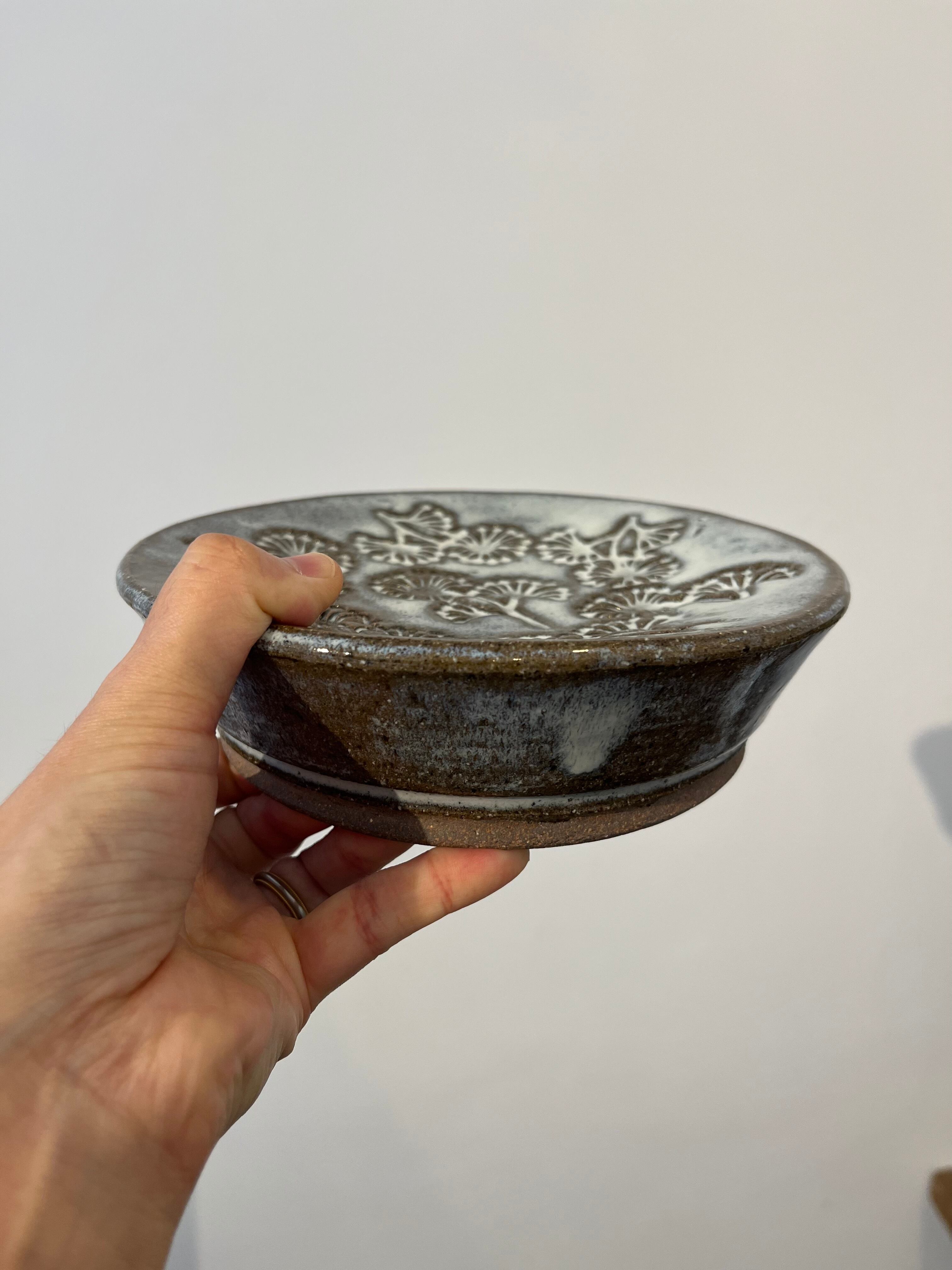 タタラ(板)の状態で特別な押し型を使い凹凸のある柄を作り、ロクロで成形して仕上げるという手の込んだ作り。内側はくり抜かれているます