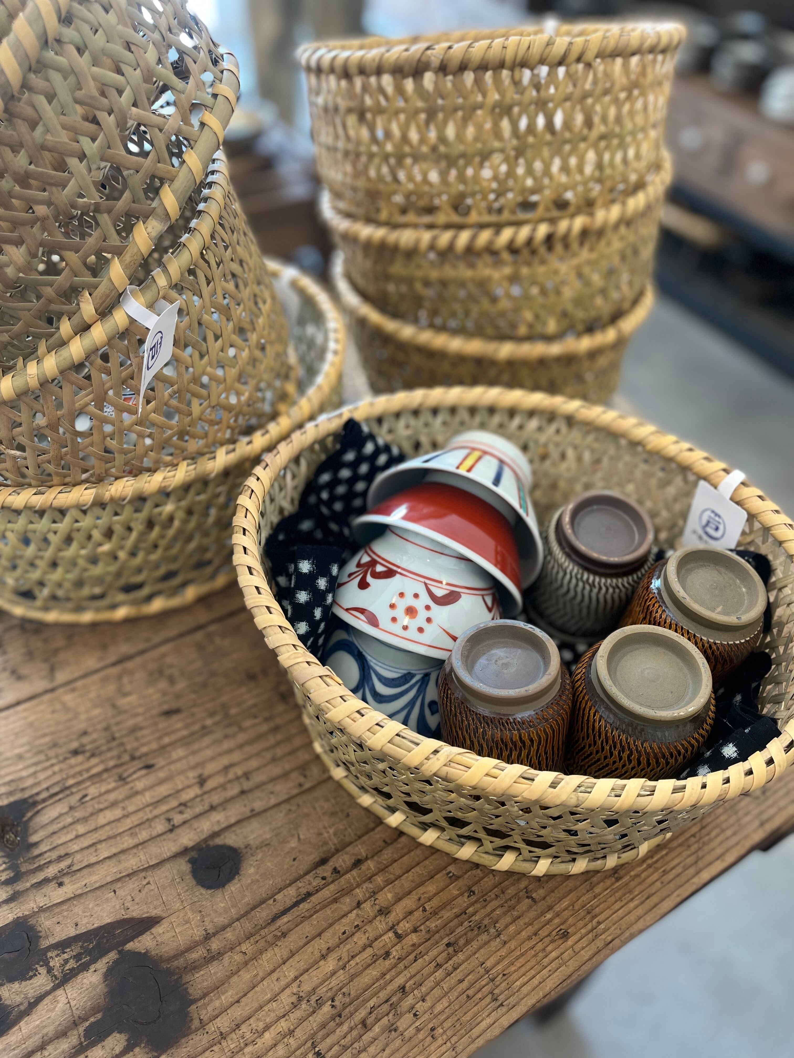 またパンや果物の見せる収納、リビング周りのリモコン入れ、キッチン周りの布巾入れなど小物いれに。色々な使い方ができる見て美しく使って楽しい竹細工です。