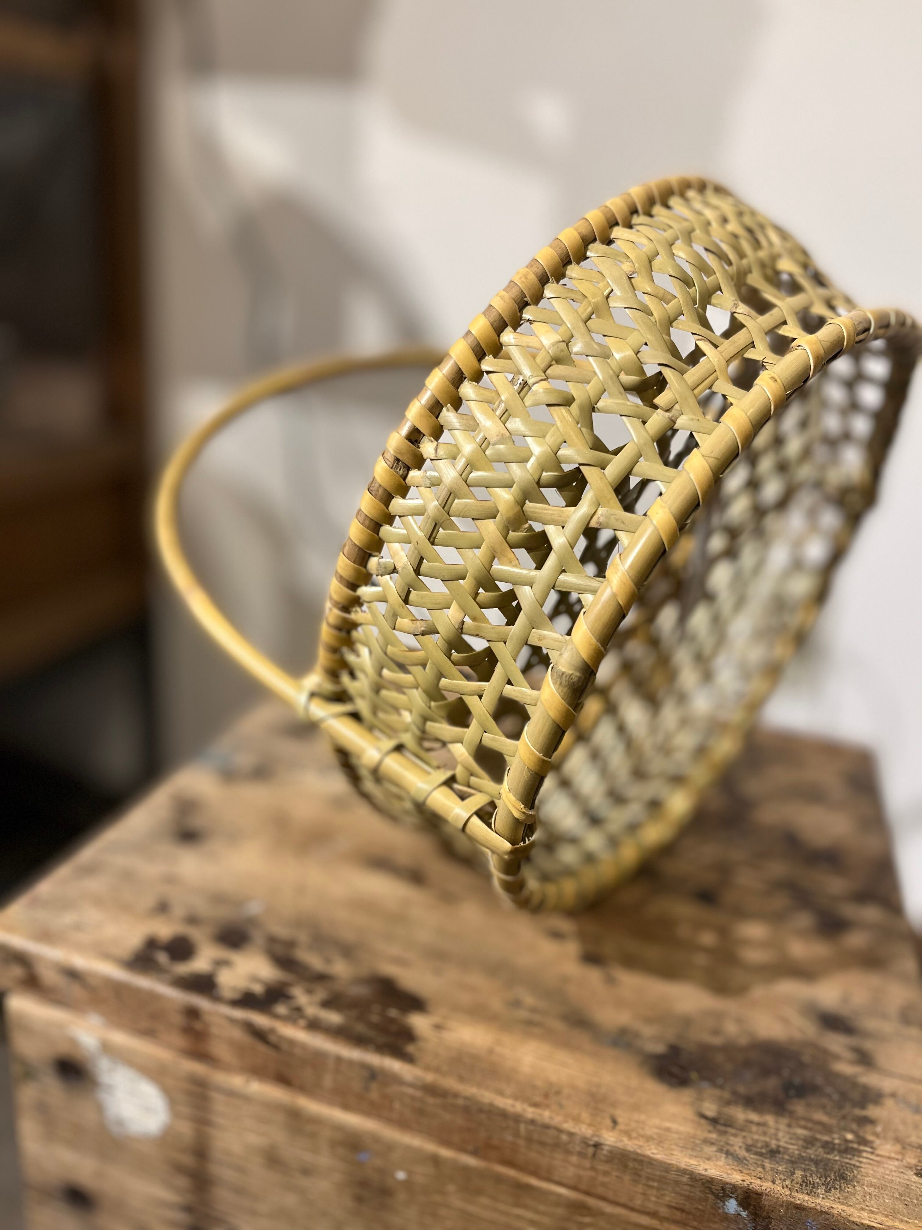 長野県戸隠産の竹細工の円筒の浅目の碗かごです。