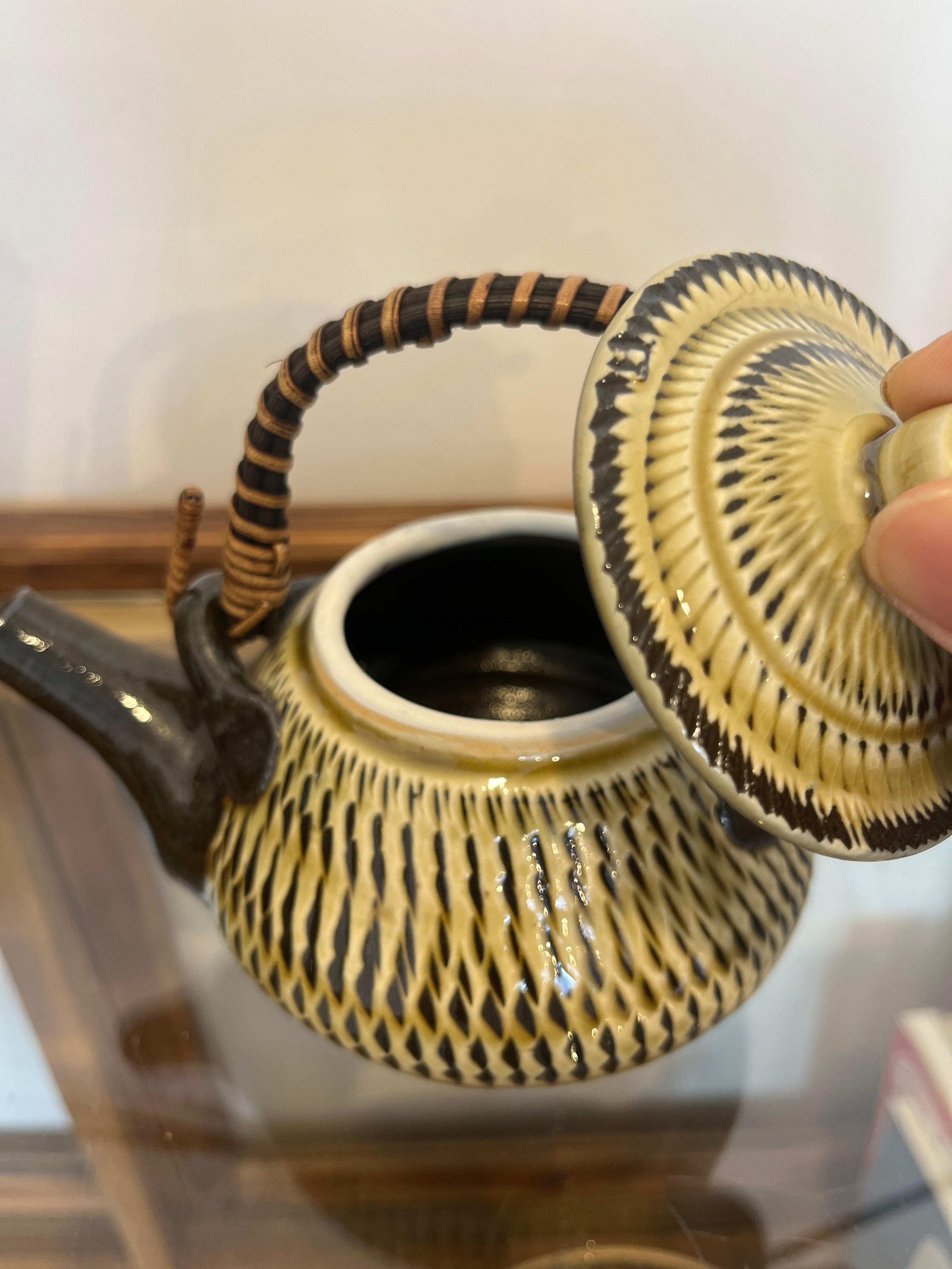 小鹿田焼 急須 土瓶型 飛びカンナ波櫛目 うぐいす