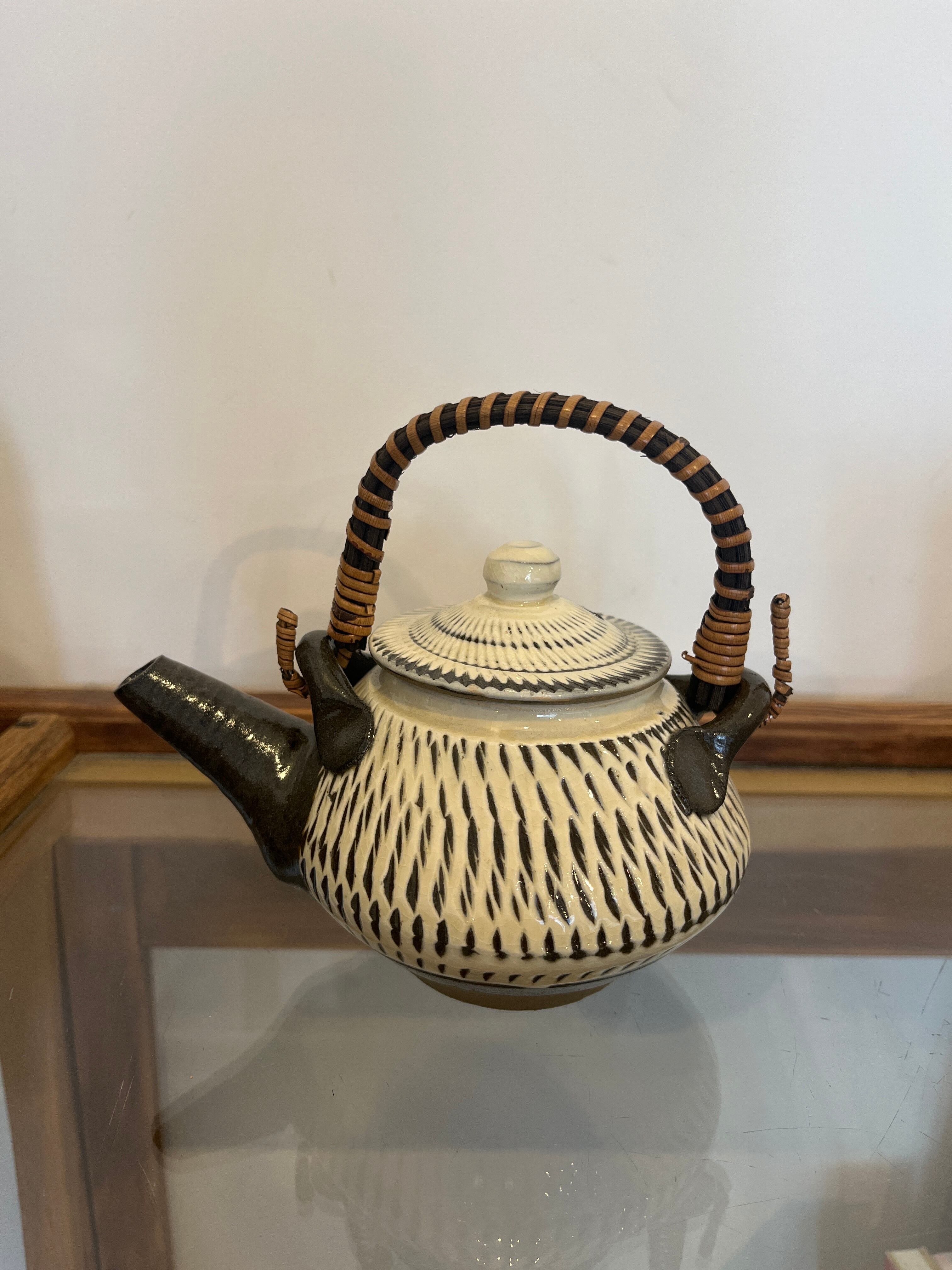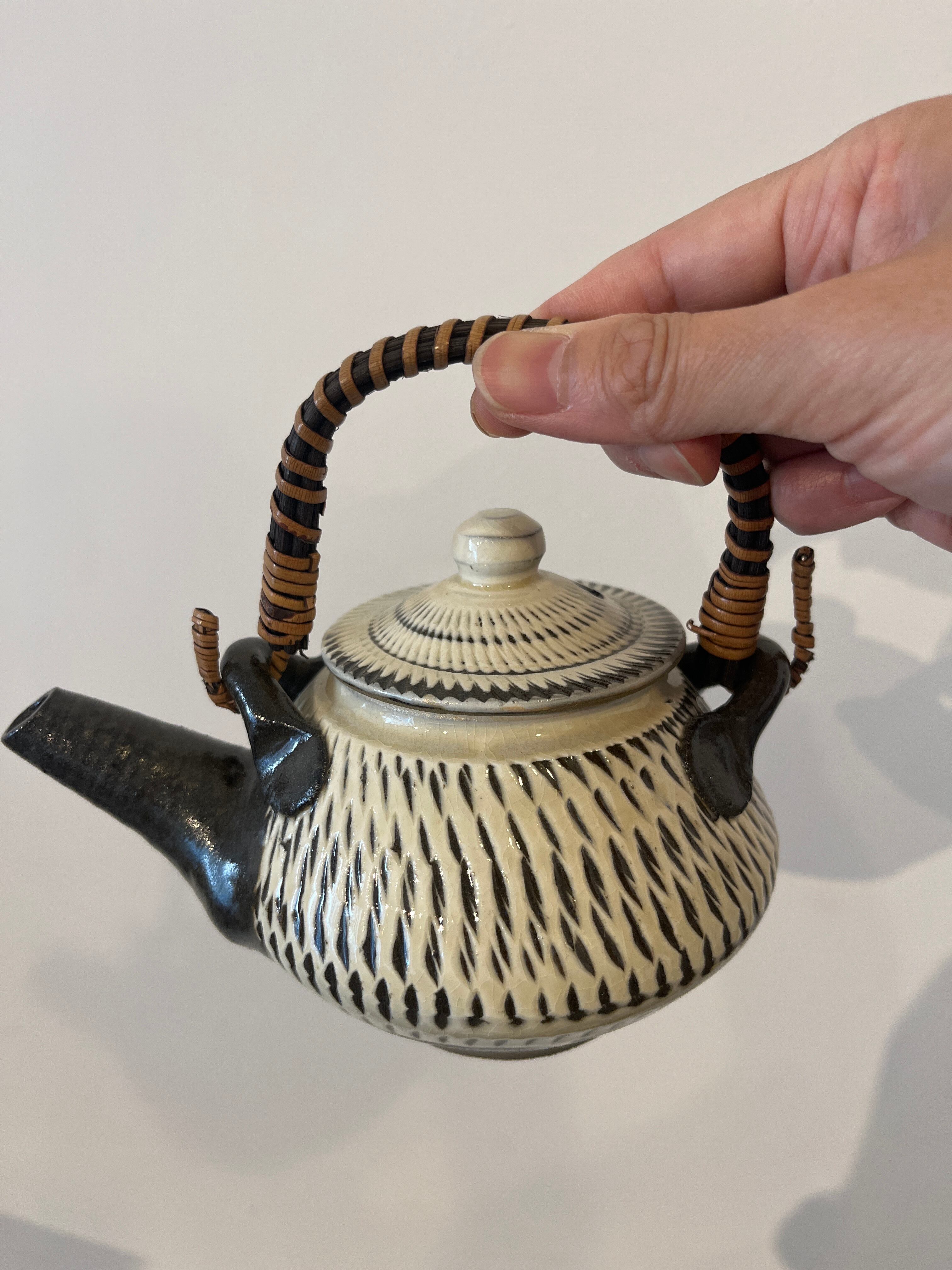 小鹿田焼 急須 土瓶型 飛びカンナ波櫛目 白