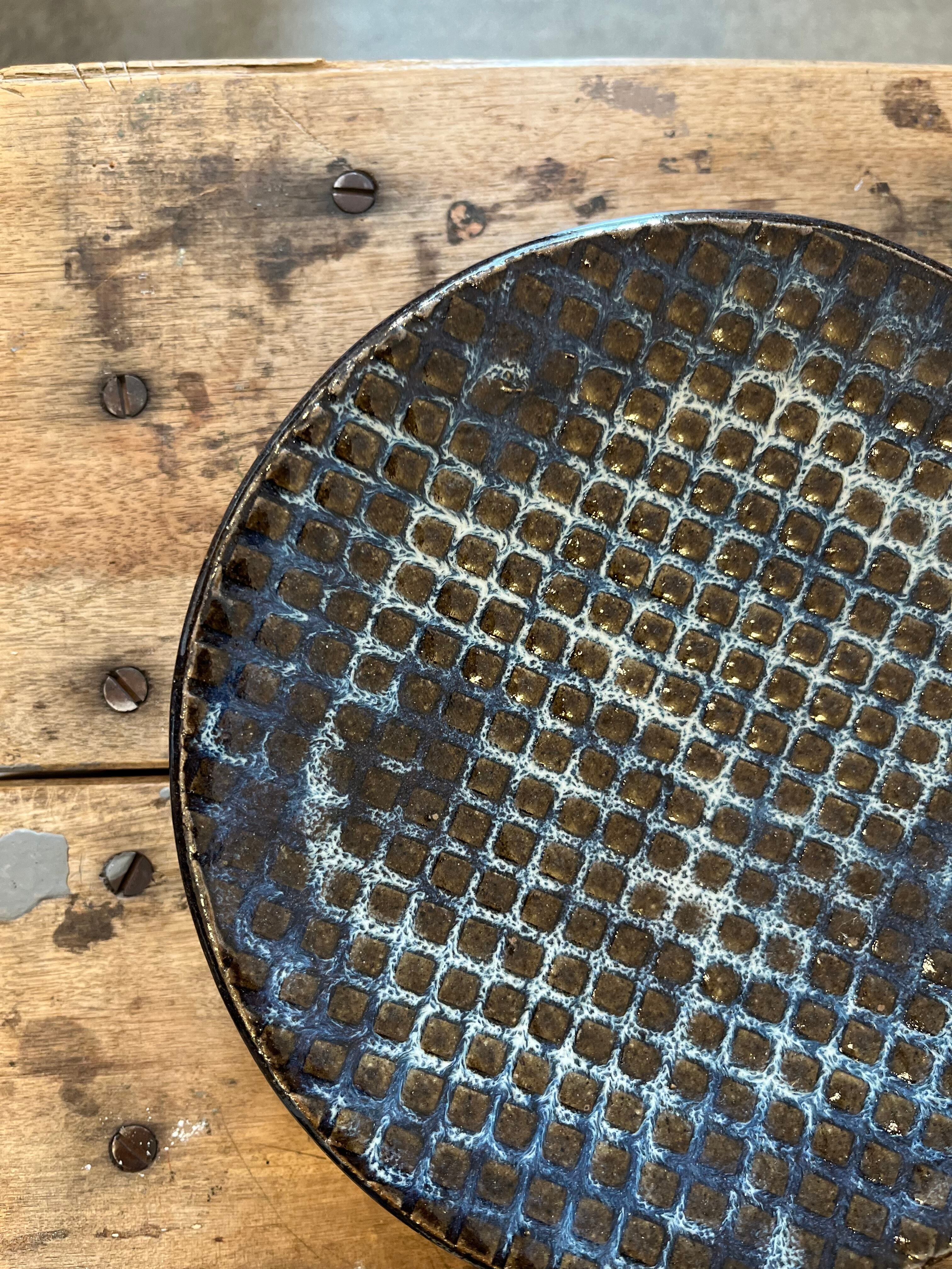 小代焼 瑞穂窯 福田るい 印花台皿 ブルー(呉須)ドット