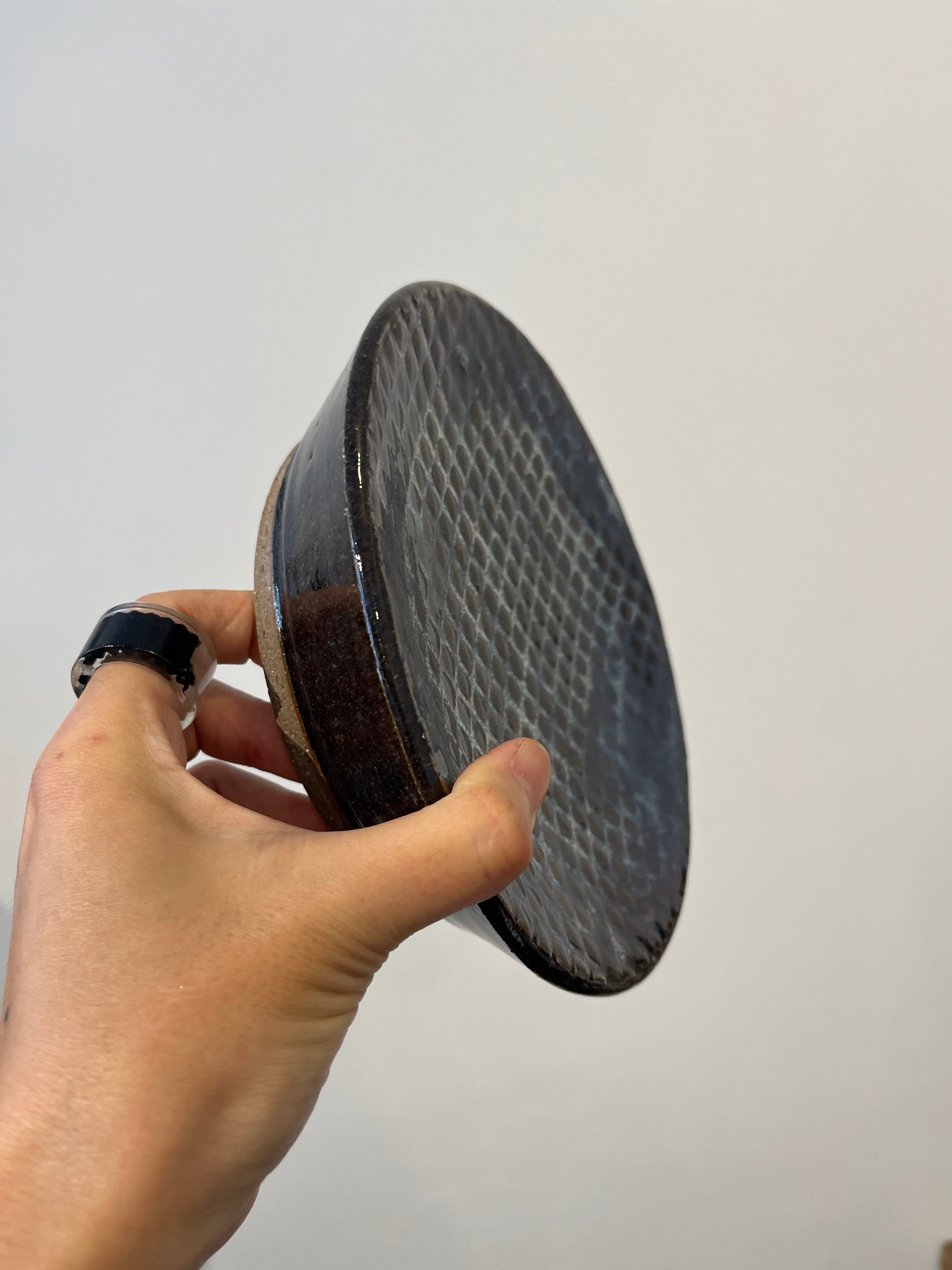 タタラ(板)の状態で特別な押し型を使い凹凸のある柄を作り、ロクロで成形して仕上げるという手の込んだ作り。内側はくり抜かれているます